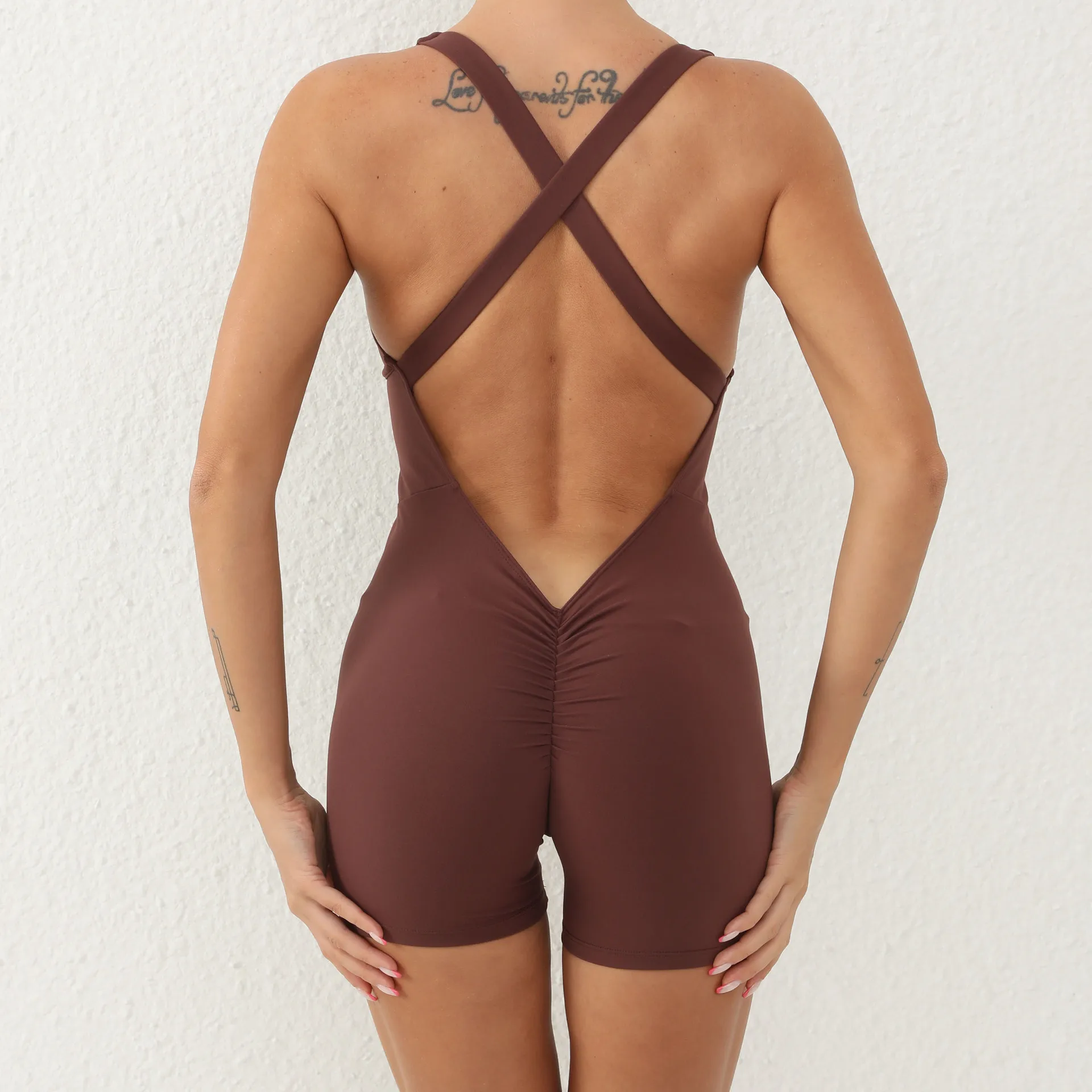 Wholesale Women Nude Sports One Pieces Playsuits Naked Sexy Back Shorts Quick Drying Breathable Running Yoga Jumpsuits